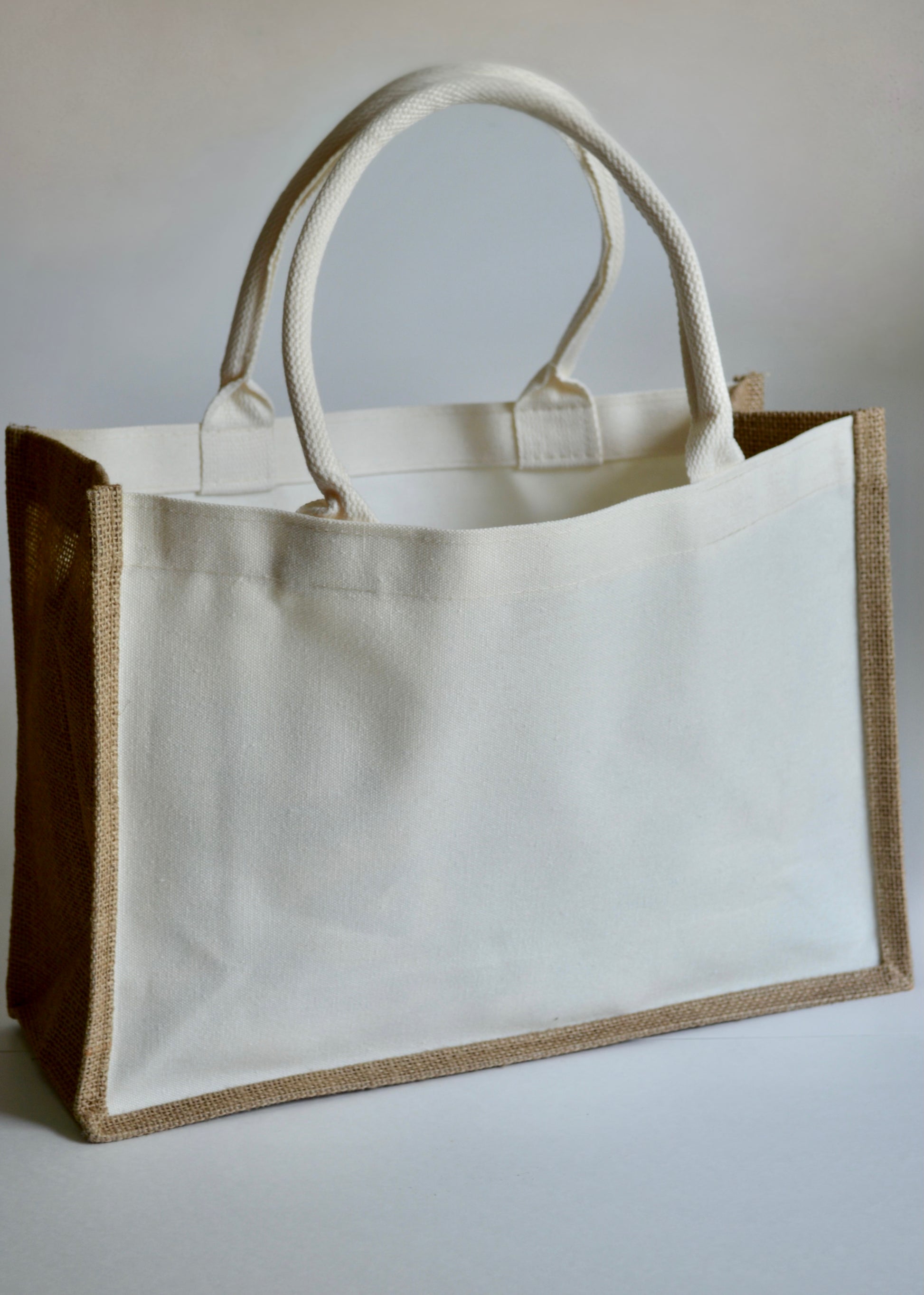 This structured tote bag features a sturdy canvas front and back with natural jute sides and trim