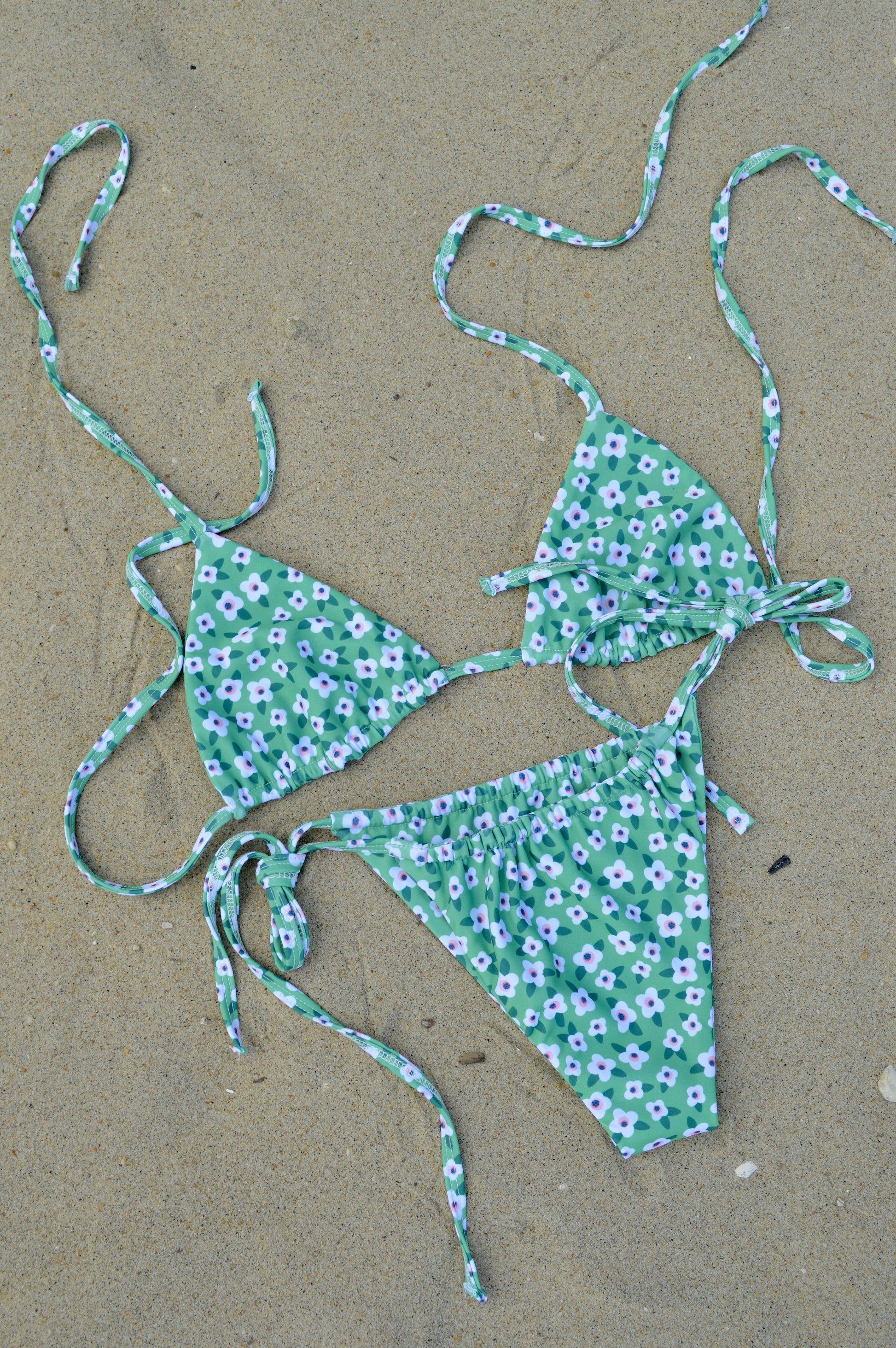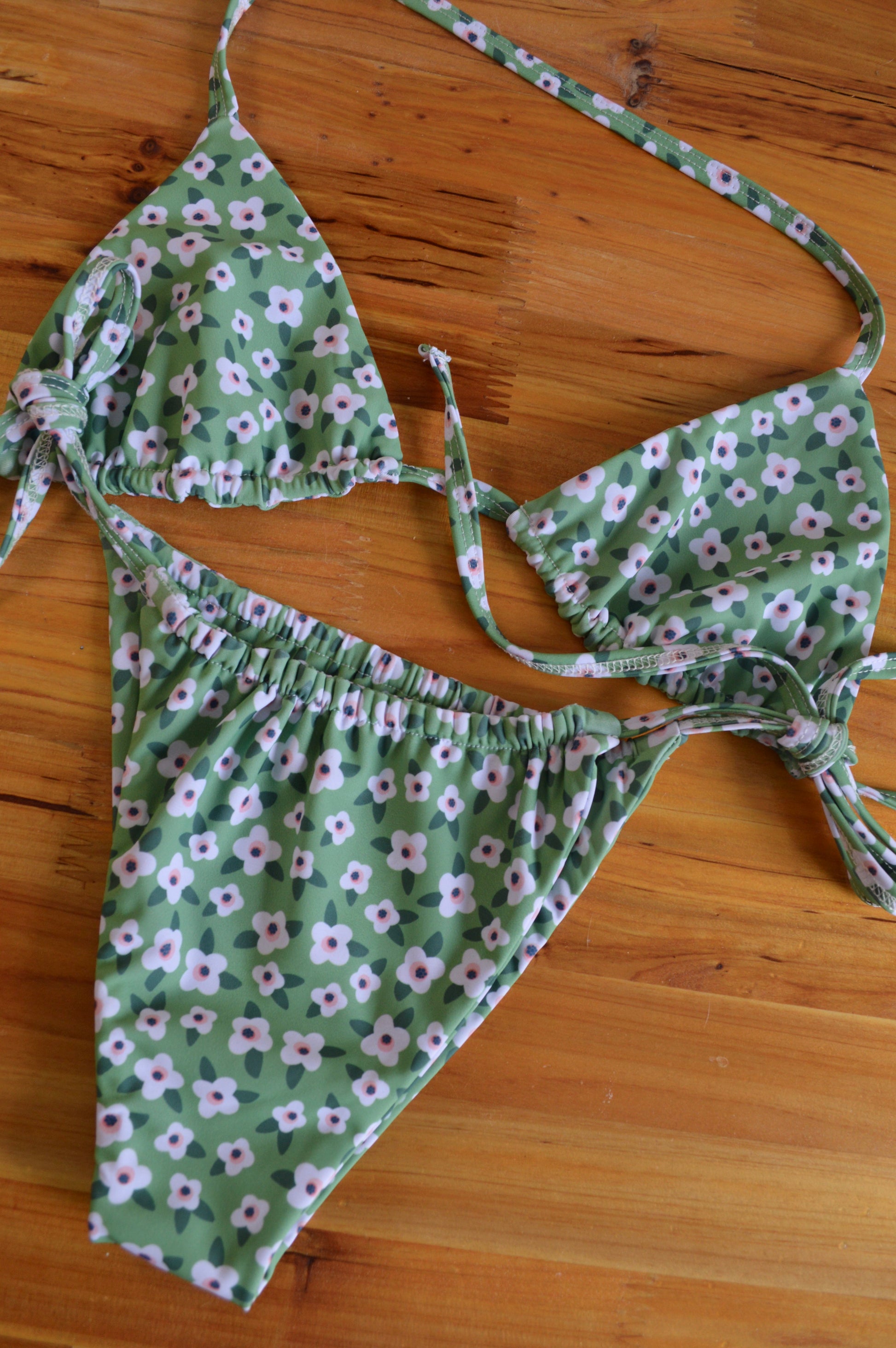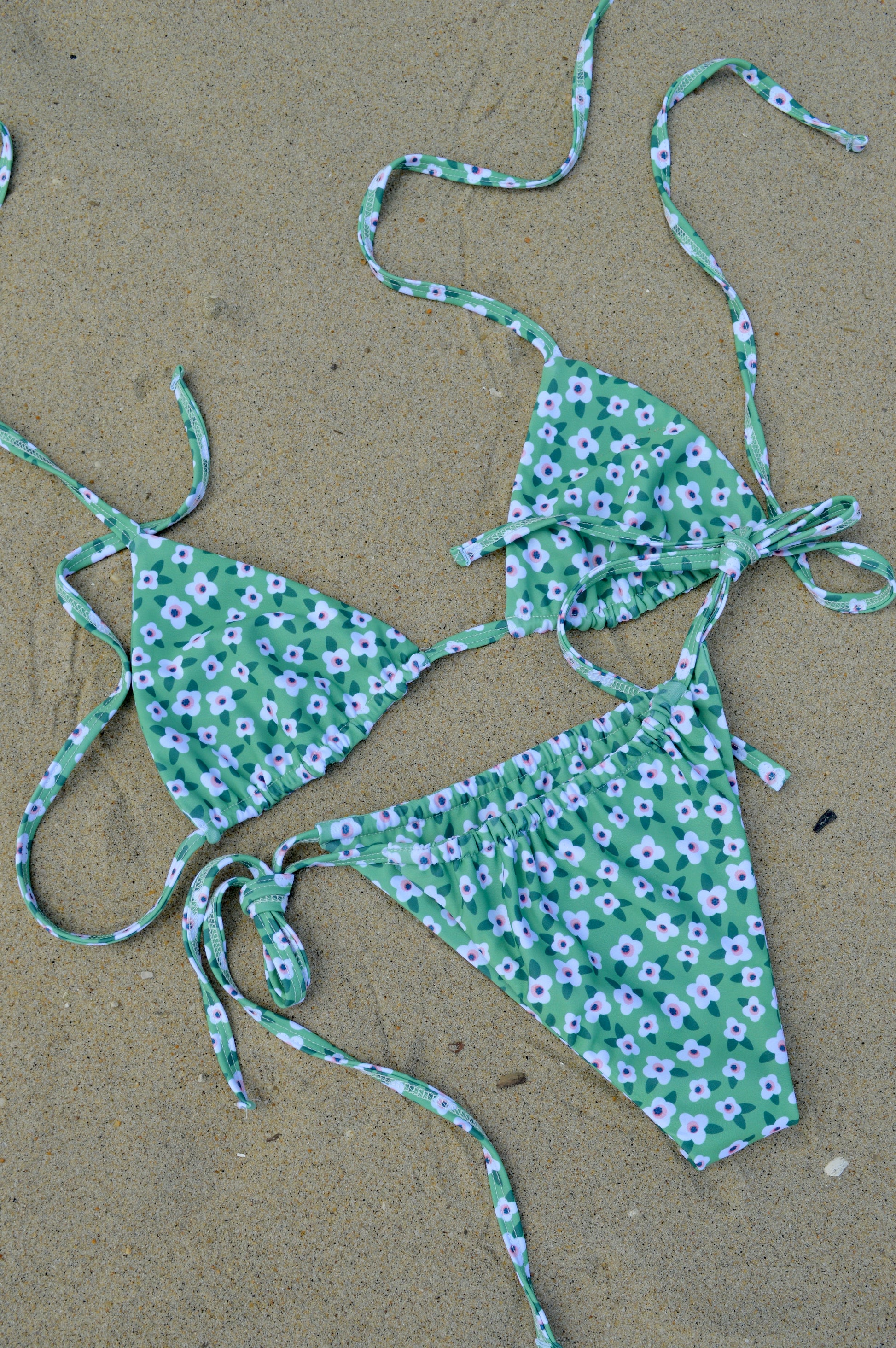 Cute, comfy, and a little bit cheeky—the ruched bikini bottom is made for sun-soaked days. Its versatile fit lets you wear it mid-rise for a classic look or low on the hips for something a little more daring. The soft green floral fabric features a dreamy blend of white and pink blossoms, all in a super soft, high-stretch material that flatters from every angle.