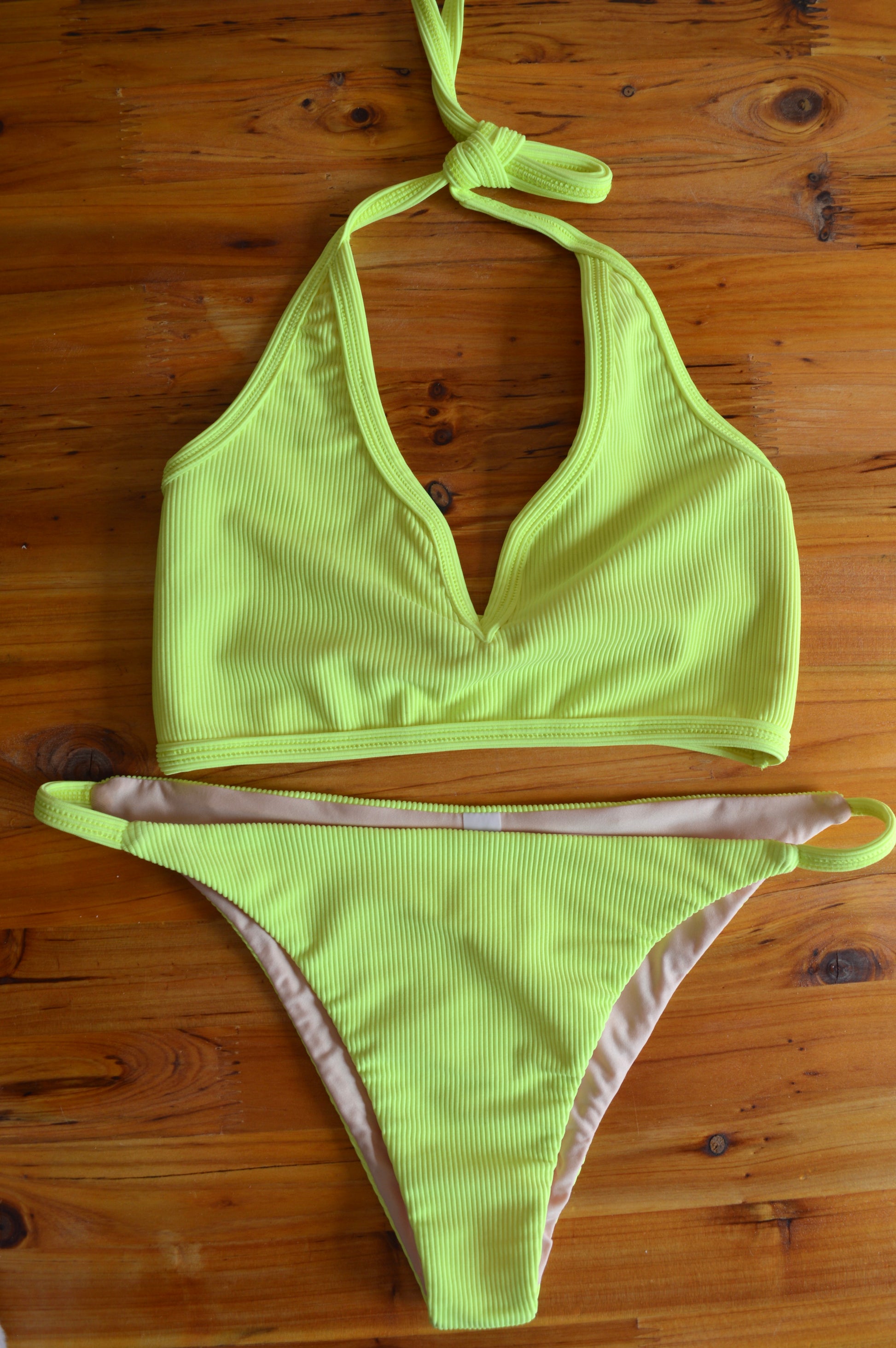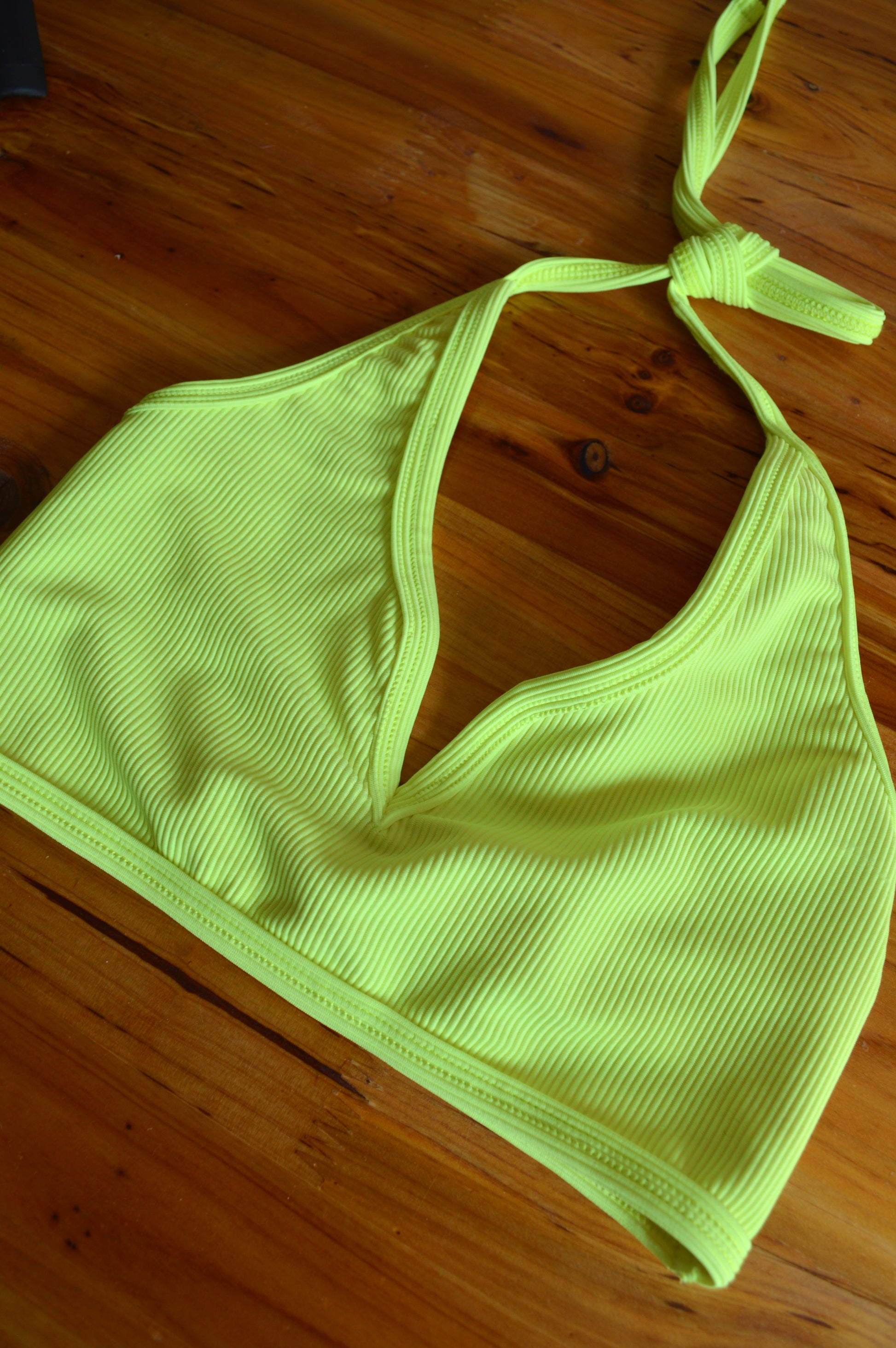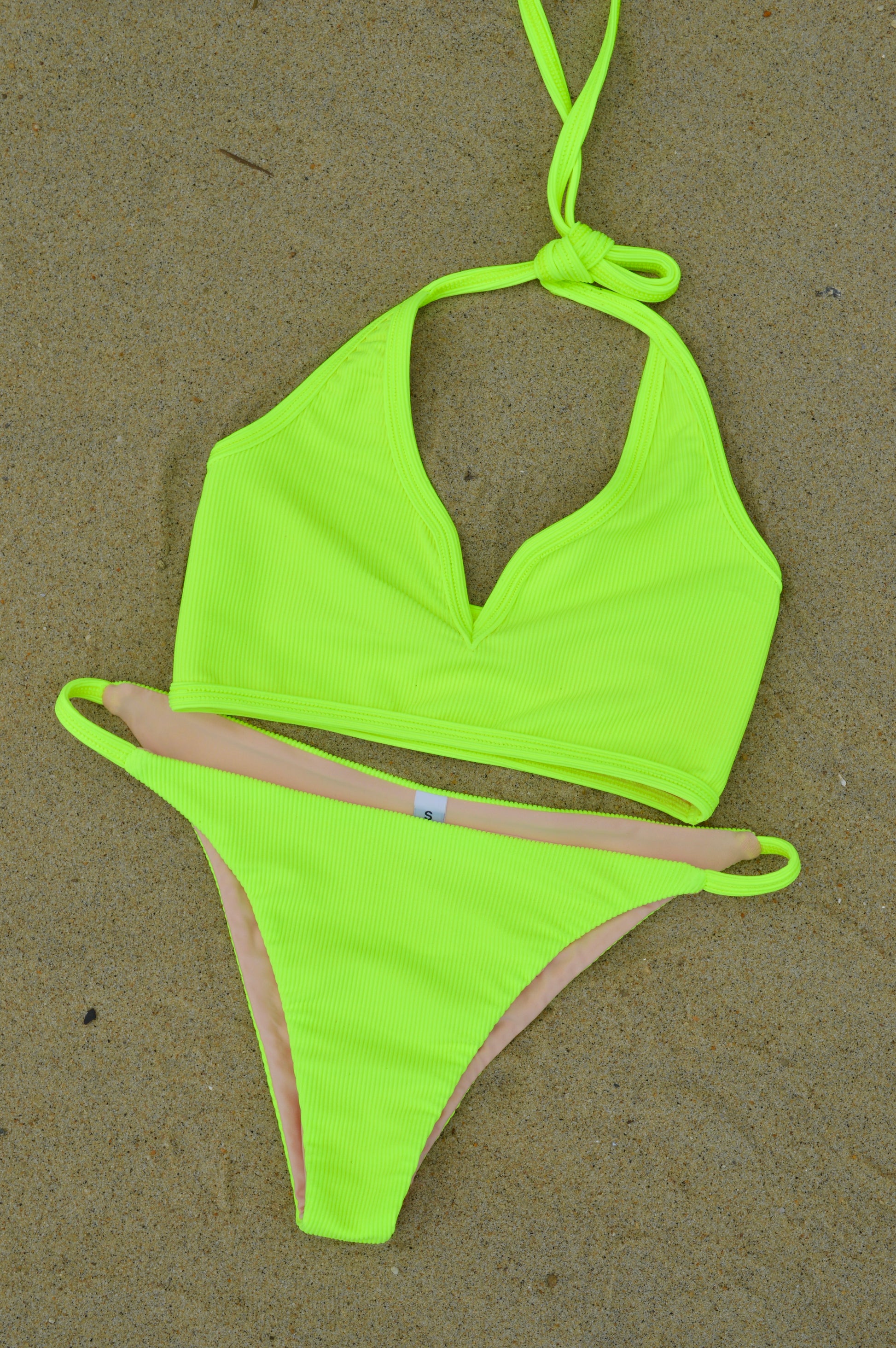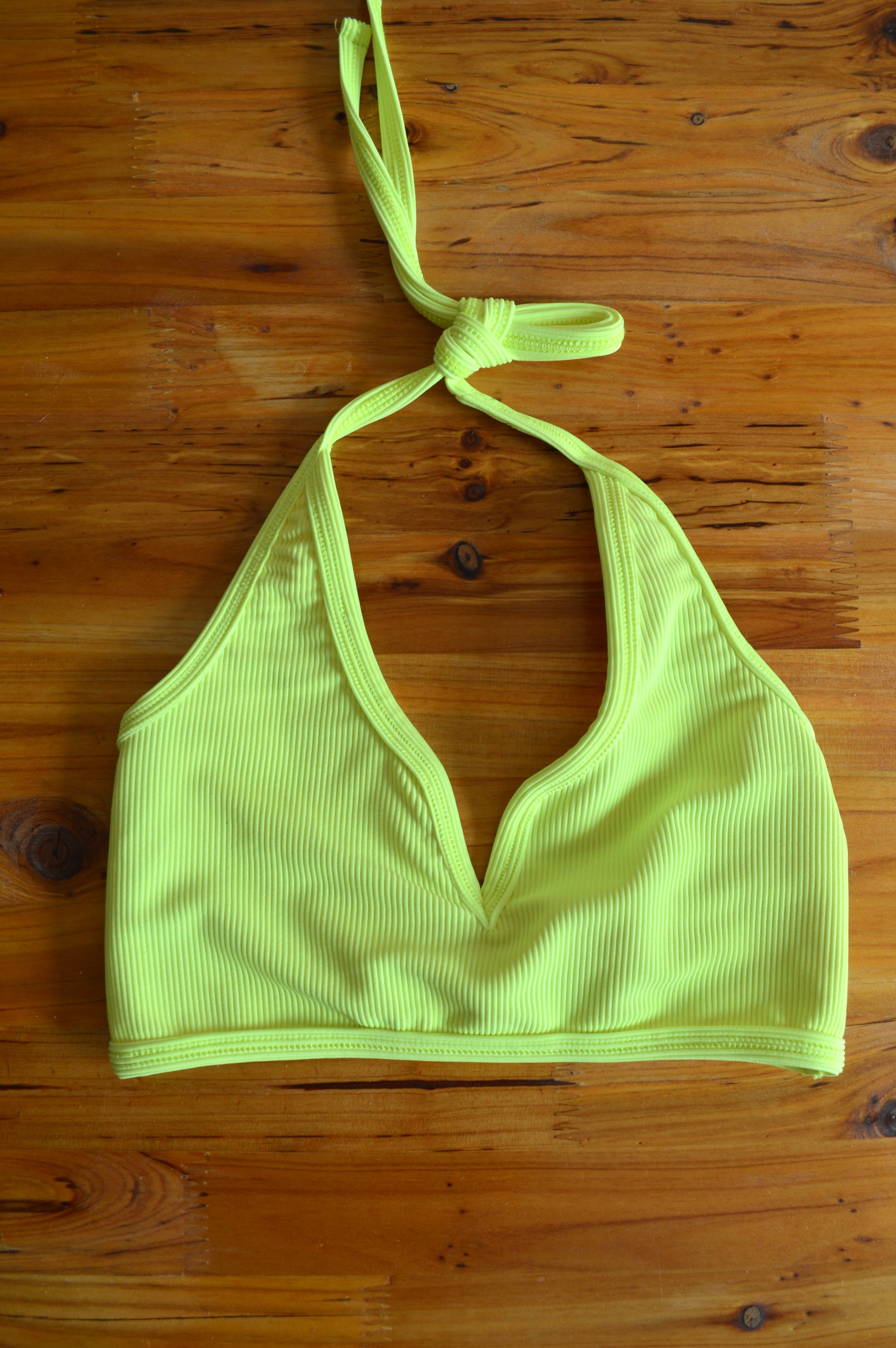 Turn up the heat in this vibrant V-Cut halter bikini top, designed for bold beach days and confident poolside lounging. Featuring a sporty silhouette with a deep V cutout at the front, this top blends athletic structure with a sultry twist. The adjustable halter ties offer custom support while framing your neckline just right. Made from premium ribbed fabric with four-way stretch and full lining, it moves with you while holding its shape. In a high-impact neon yellow, this top is made to pop against sun-kissed skin and highlight your golden glow.
